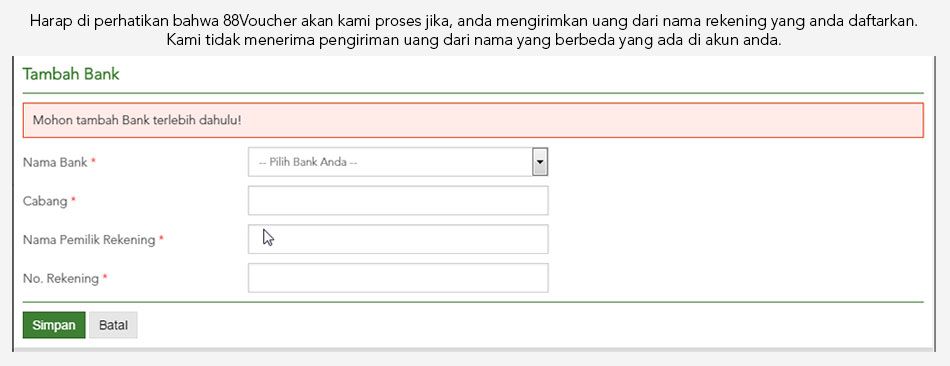Tahap 05Setelah anda meng klik tombol BELI SEKARANG anda akan di arahkan untuk mengisi data akun bank.Beli Voucher